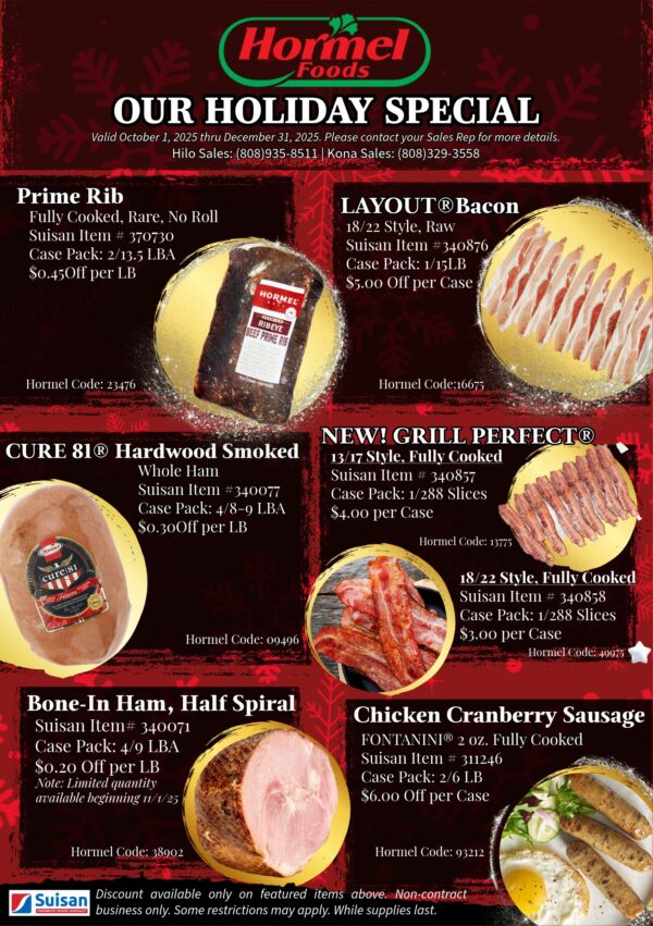 HOLIDAY SPECIAL FROM HORMEL October 23, 2025 News Explore Hormel’s Holiday Special Discount available only on featured items above. Non-contract business only. Some restrictions may apply. While supplies last. Contact your Hilo Sales Rep for more information Hilo Sales (808) 935-8511 | Kona sales (808)329-3558 Share This Twitter Facebook LinkedIn Email