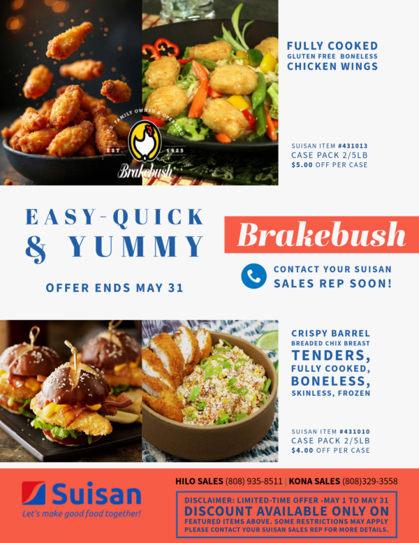 Brakebush Upcoming Offer! April 22, 2026 News EASY – QUICK & YUMMY BRAKEBUSH Some restrictions may apply–Consult with your Suisan Rep! Hilo Sales (808) 935-8511 | Kona sales (808)329-3558 Share This Twitter Facebook LinkedIn Email