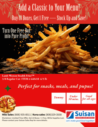 BUY 10 BOXES, GET 1 FREE !- STOCK UP AND SAVE! Lamb Weston Stealth Fries™ 3/8 Regular Cut ITEM # 640458 6/5 lb. - click on the poster to have a better view - Hilo Sales (808) 935-8511 | Kona…