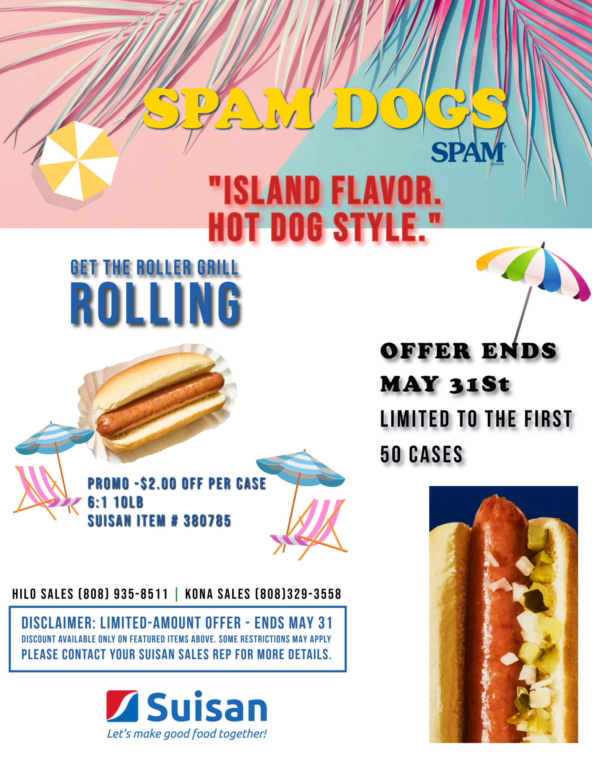 “ISLAND FLAVOR HOT DOG STYLE” April 22, 2026 News, Sale SPAM DOGS OFFER STARTS MAY 1ST & ENDS MAY 31 ST! Some restrictions may apply-Consult with your Suisan Rep! Hilo Sales (808) 935-8511 | Kona sales (808)329-3558 Share This Twitter Facebook LinkedIn Email